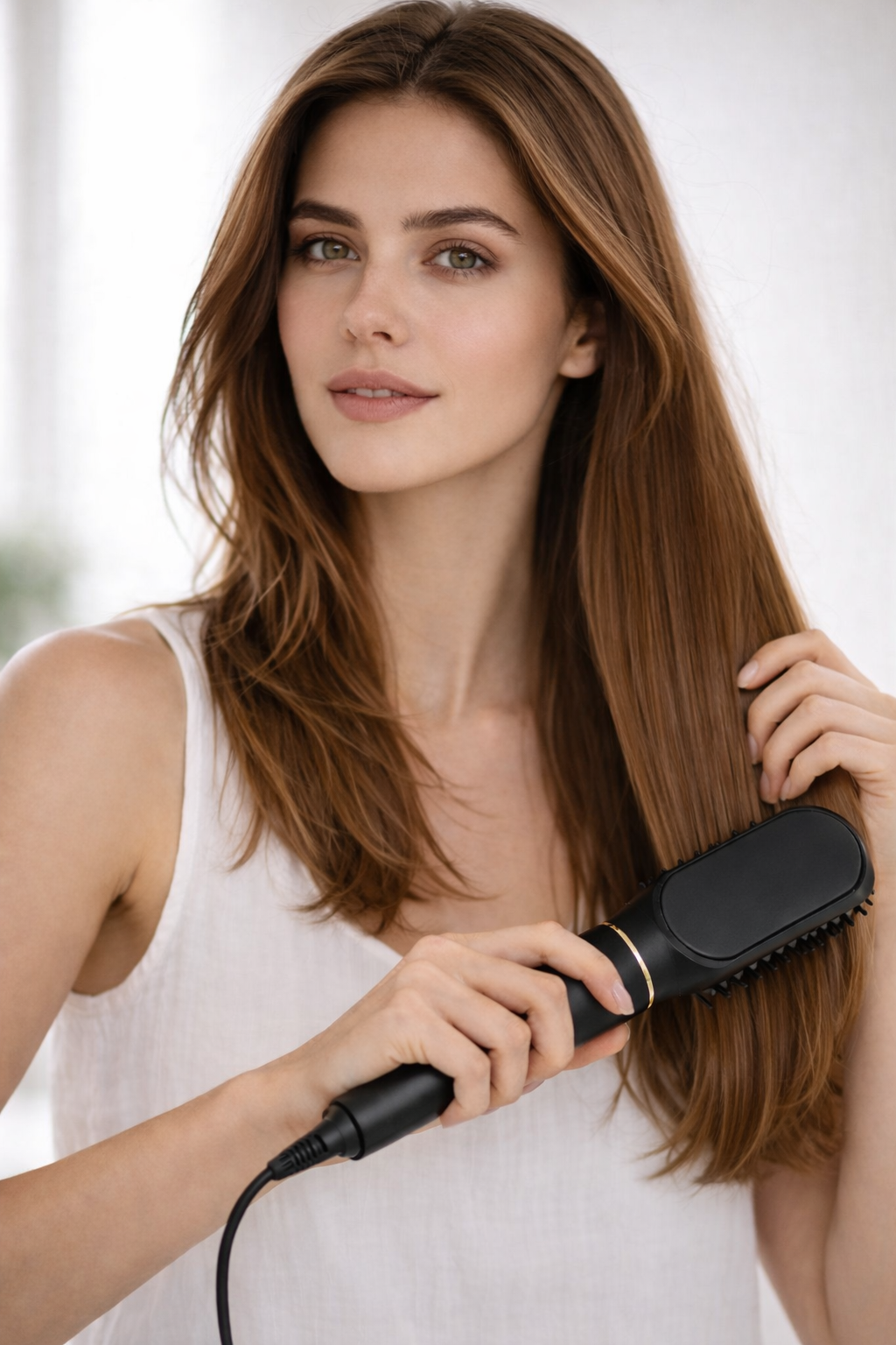 4. Desliza suavemente desde la raíz hasta las puntas para un acabado uniforme.