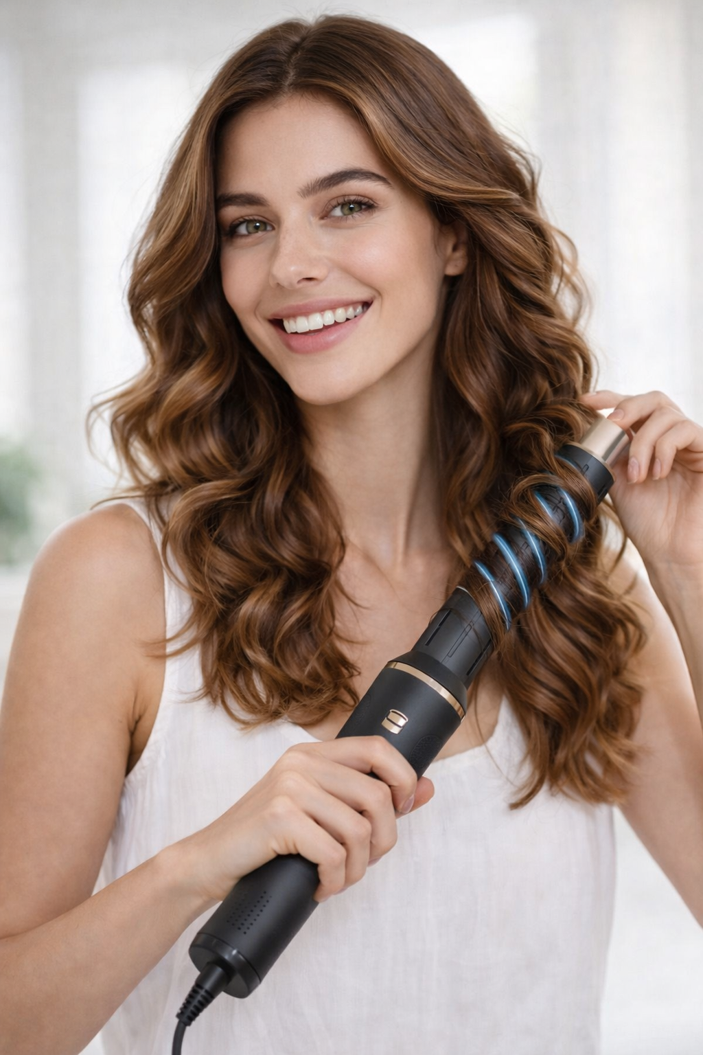 Para finalizar, utiliza el accesorio rizador si deseas crear ondas o rizos. Toma pequeños mechones de cabello y envuélvelos suavemente alrededor del accesorio mientras el aire caliente fija la forma. Mantén unos segundos y suelta el mechón para revelar ondas naturales y definidas. Este último paso aporta movimiento, estilo y un acabado con aspecto profesional, como recién salido de la peluquería.